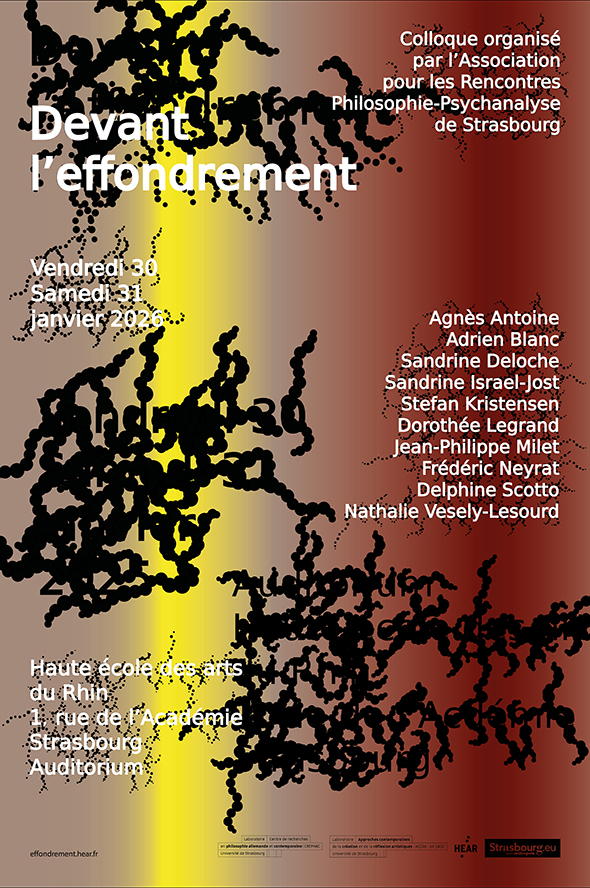 Dans le cadre du premier colloque de l’Association pour les Rencontres Philosophie-Psychanalyse de Strasbourg (ARPPS), la HEAR invite philosophes et psychanalystes à dialoguer sur la question de l’effondrement. Elle sera abordée dans ses différentes dimensions : clinique, écologique, politique, esthétique.