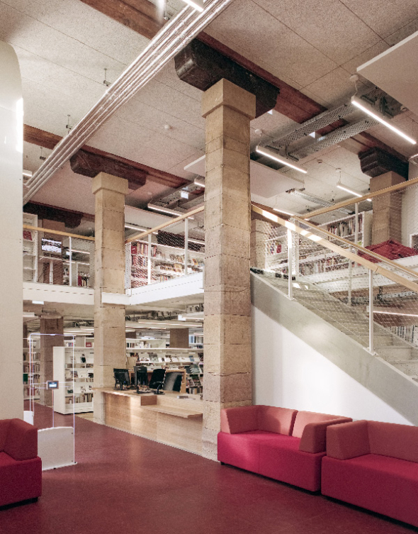 Après dix ans de projet et de travaux, la bibliothèque de la Manufacture – Arts & sciences ouvrait ses portes le 2 décembre 2024 au sein de la Manufacture des tabacs. Sur 700m² se déploient désormais les collections mutualisées de l’École nationale du génie de l’eau et de l’environnement de Strasbourg (ENGEES), de l’École et observatoire des sciences de la terre (EOST) et de la Haute école des arts du Rhin (HEAR), pour une collection commune de 65 000 volumes.