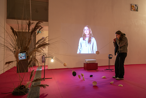 En amont de l’exposition, l’artiste proposait aux étudiant·es un workshop de 3 journées à l’école et dans les forêts environnantes pour penser-performer-filmer une « école de la morsure », accompagnée de l’artiste et enseignante Marine Froeliger.