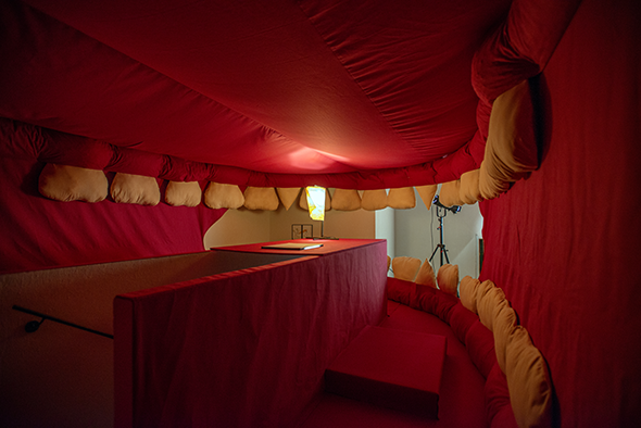 Anne Le Troter déploie La cithare de Capivacci dans l’espace de La Chaufferie : une installation sonore composée de quatre sculptures à mordre, réunissant des professionnel·les de la morsure pour montrer une « école de la morsure ».