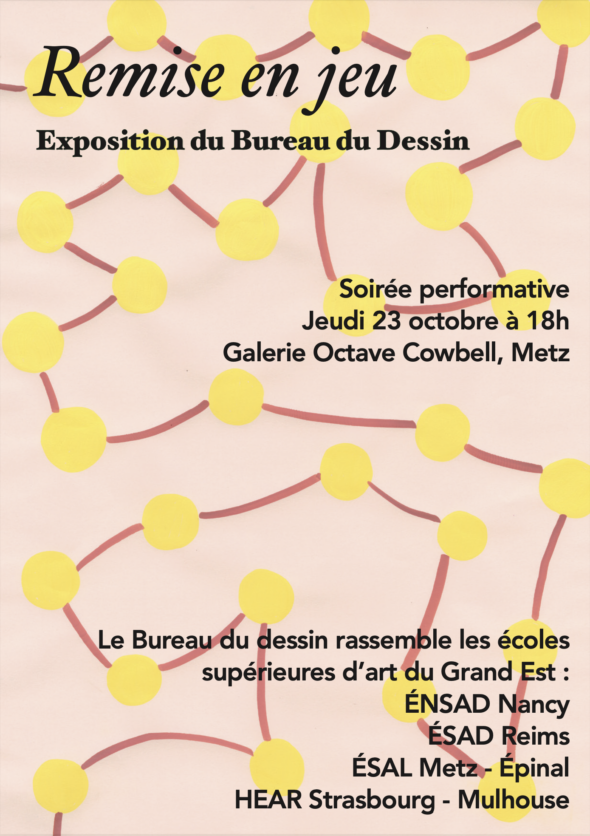 Depuis 2008, Le Bureau du dessin imagine des rendez-vous inédits autour des multiples formes du dessin, réunissant étudiant·es et enseignant·es des quatre écoles supérieures d’art du Grand Est : l’ENSAD Nancy, l’ÉSAD Reims, l’ÉSAL Metz/Épinal et la HEAR Strasbourg/Mulhouse.