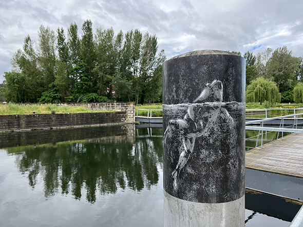 Parmi les projets marquants de son cursus, Grandeur Nature, mené en troisième année, occupe une place particulière. En travaillant sur la trame noire — un enjeu écologique et urbain lié à la pollution lumineuse — elle réalise une série d’illustrations exposées sur la passerelle du parc du Heyritz, à Strasbourg. Une première confrontation à l’espace public formatrice, où elle voit ses images évoluer dans le temps, dialoguer avec le paysage urbain et les passant·es, permettant à sa pratique de s’inscrire durablement.