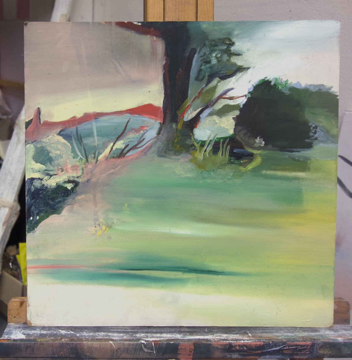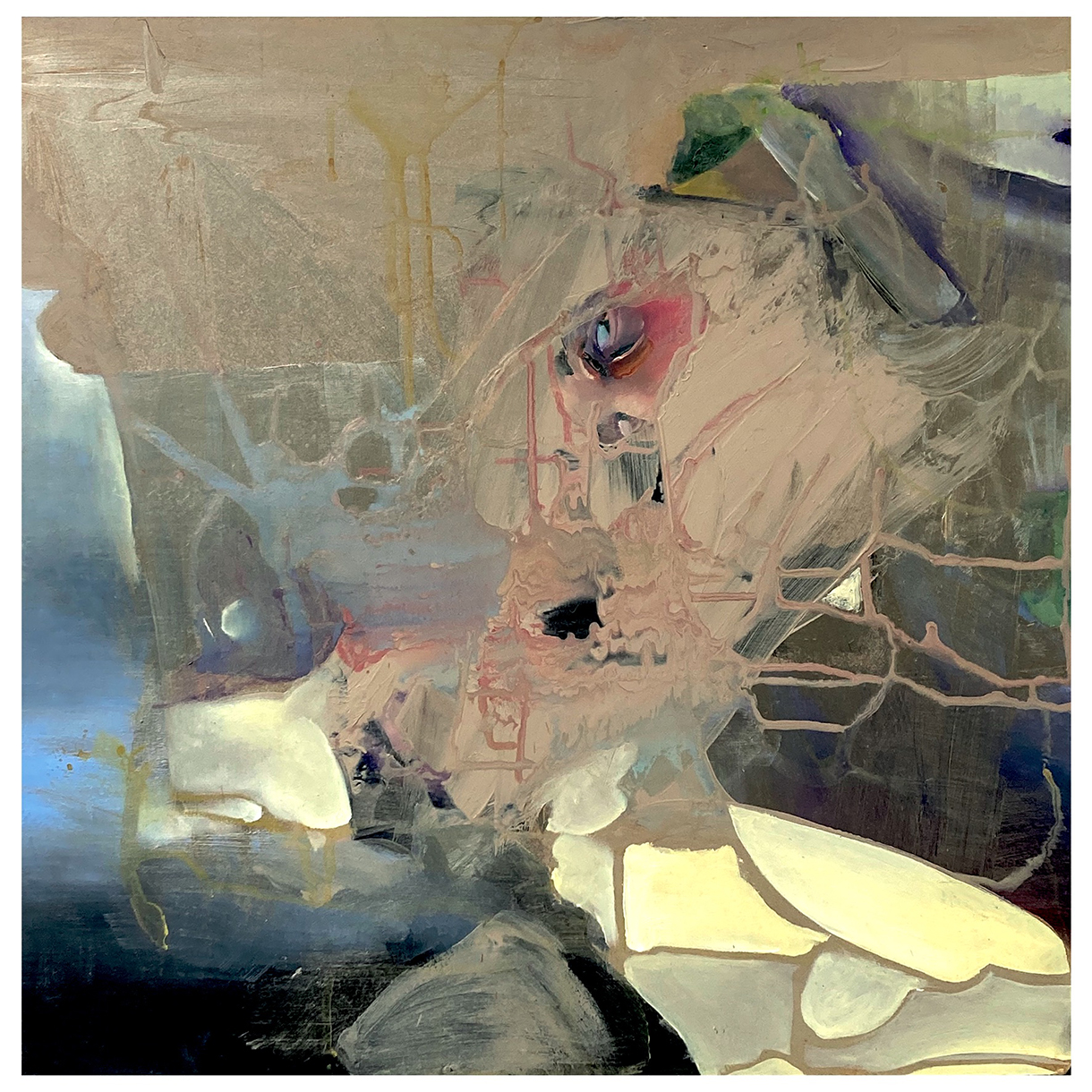 EN My work centres on sensitivity, contemplation, and connection. I enjoy working on site, and the using recycled materials for my paintings: I place great importance on the environment in which I live and work. By reversing my boards in the studio and using colours and drips, I seek to find light within opacity — a bit like a stained-glass window emerging from a blind surface. This meditative approach has taken over from using live models.