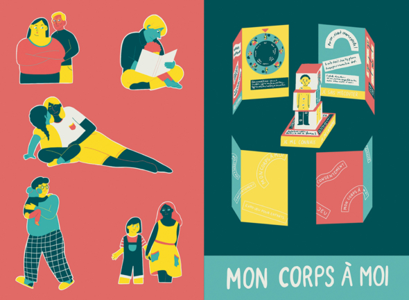 Pour « Mon corps à moi », je propose aux enfants de se familiariser avec les notions de consentement sous la forme d’une exposition itinérante et didactique.